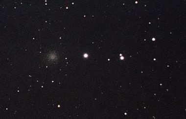 NGC 2419 photo courtesy of Mike RichmannAs I discussed in an earlier story, globular clusters hold up well when viewed from washed-out skies. In that story I highlighted the biggest and brightest globulars. Today I want to discuss a globular cluster that is neither big nor bright, but is nevertheless very interesting: NGC 2419, the so-called Intergalactic Wanderer. It got its name because it is so far from the galactic center (300,000 light years, farther than the Magellanic Clouds and well beyond the “halo” containing most globular clusters) that it was long believed to wandering through space independently. We now know that NGC 2419 is indeed gravitationally bound to our galaxy, taking about 3 billion years to complete an orbit. (Photo courtesy of Mike Richmann)
