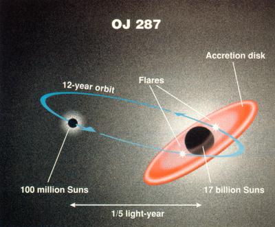 Quasars are cool objects in and of themselves. But there are other reasons that make these fascinating objects. One is the tremendous distances involved: 3C 273 is 2.5 billion light years away and OJ 287 is over 3.5 billion light years away. They are also powered by massive black holes: Mrk 421 has a black hole of about a billion solar masses; OJ 287 has a binary pair of black holes, the primary weighing in at 18 billion solar masses—the largest black hole known.